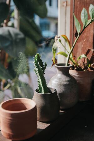 Close-up, ornamental plants for home decor on a shop window.