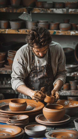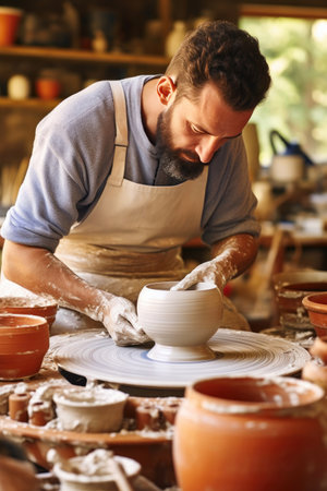 A talented artisan skillfully shapes clay into a stunning bowl on a pottery wheel. The scene captures the artistry and dedication involved in creating handcrafted ceramics, highlighting the tactile connection between the artist and the clay.