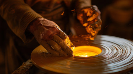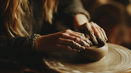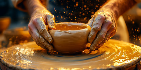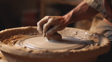 A potter works on a clay vase using a spinning wheel, hands covered in mud. The image showcases the process, highlighting the texture and color of the clay. The lighting provides shadows, with a focus on form. This image could be used for illustrating craftwork or artisanal skill.