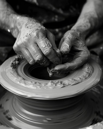 A potters hands shaping clay on a pottery wheel showcasing theart.tistry and creativity in their craft. Black and white art.