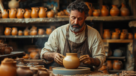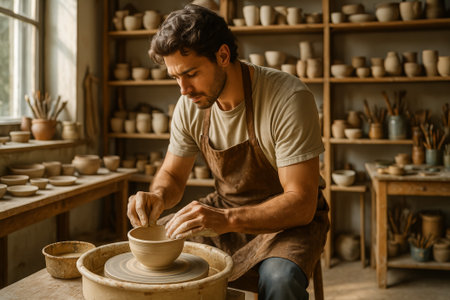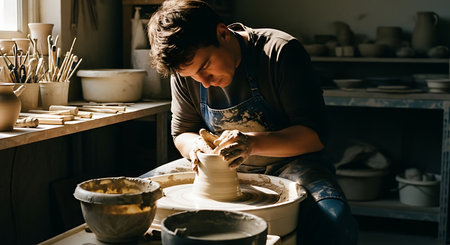 A focused craftsman meticulously molds a piece of clay on a spinning pottery wheel, surrounded by tools and other ceramic works in a rustic, sun-drenched studio.