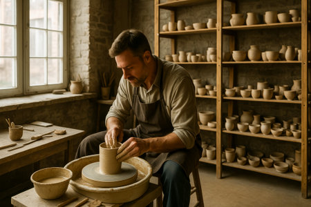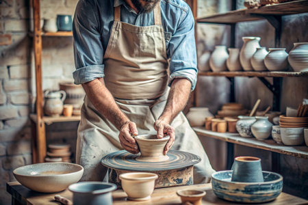 Craftsman skillfully molds a lump of clay on a spinning pottery wheel, showcasing traditional techniques in an artisan studio filled with tools.
