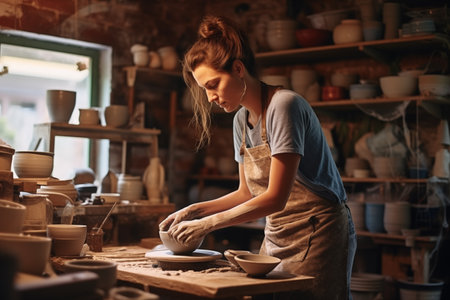 A detailed portrait of a female artisan focused on crafting pottery, surrounded by handmade ceramic pieces in a studio workshop.