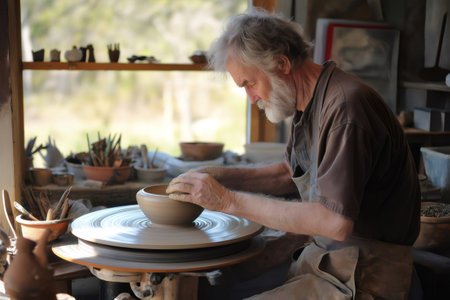 Senior potter skillfully shaping clay into a bowl on the pottery wheel, immersed in the art of craftsmanship within his workshop