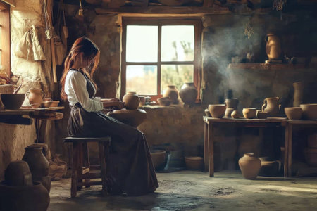 A young woman works diligently on a pottery wheel, shaping wet clay into a bowl. Sunlight streams into the serene studio, highlighting her concentration and creativity.
