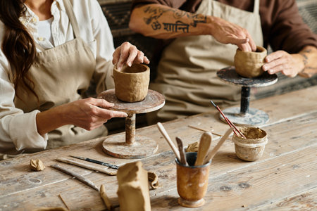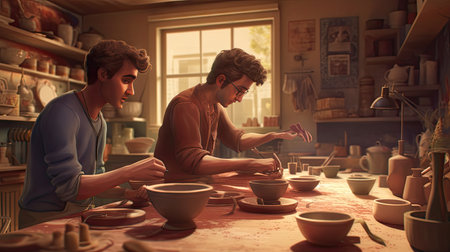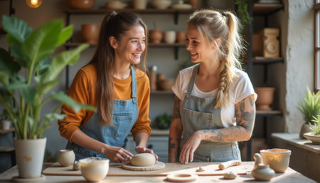 In a warm and inviting pottery studio, two women share laughter and creativity as they mold clay into beautiful shapes. Surrounded by handmade pottery and lush greenery, their camaraderie and passion for art shine through, making this scene a celebration of friendship and creativity.