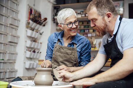 Senior woman spinning clay on a wheel with a help of a teacher at pottery class