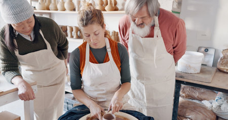 Pottery, group and teacher mold clay in studio or workshop learning with instructor woman, coach or trainer. Lesson, art and people practice hobby, arts or crafting handmade ceramic mug, cup or bowl