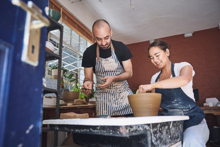 Couple working on pottery wheel in a pottery workshop.
