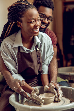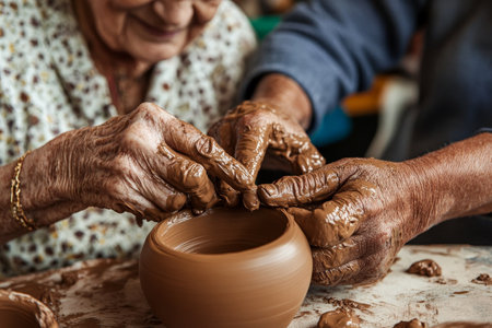 African American elderly couple taking a pottery class, their hands covered in clay as they craft beautiful, imperfect pieces together.