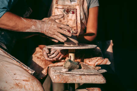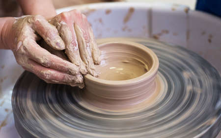 Hands of potter sculpt handmade earthenware on spinning pottery wheel in workshop closeup.