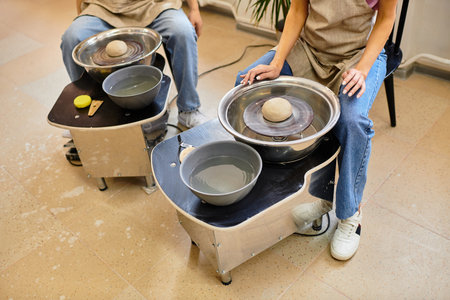 Two potters sculpt handmade earthenware on pottery wheel in workshop closeup.