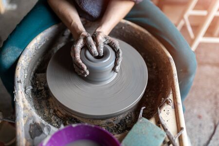 Hands of craftsman artist working on pottery wheel.Selective Focus