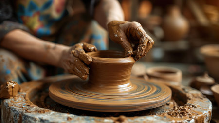 Close-up of an artisans hands skillfully shaping wet clay on a spinning pottery wheel, surrounded by tools and unfinished pieces. Resplendent.