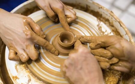 Hands of a potter. Potter making ceramic pot on the pottery wheel