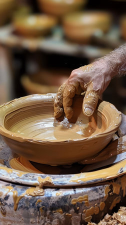 An artisan's hands skillfully shape wet clay on a pottery wheel, creating a unique bowl that reflects artistry and tradition in craftsmanship.