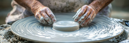 Closeup capturing the delicate art of pottery, featuring hands molding clay on a spinning wheel in a rustic studio, bathed in soft, natural light, conveying a sense of skill and creativity.