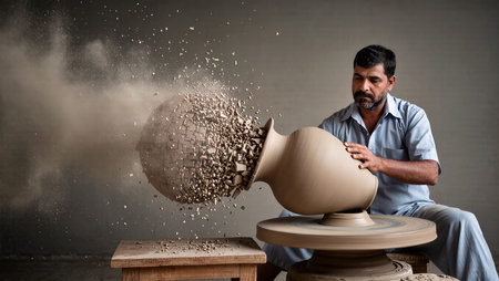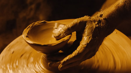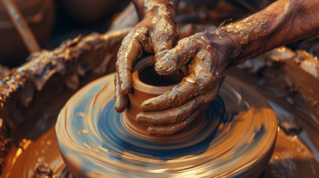 Close-up of a focused potter's hands shaping a clay vase on a pottery wheel. Clear details and vi...