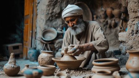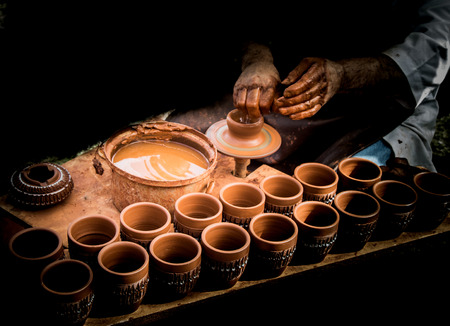 Bikaner, India - February 12, 2019: Indian potter making clay pots on pottery wheel in Bikaner. Rajasthan