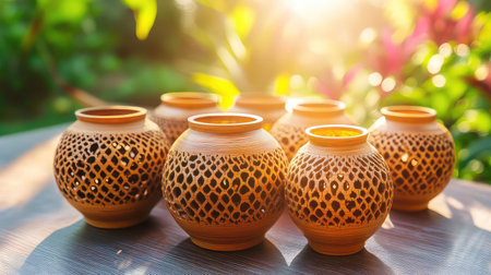 Handcrafted ceramic pots and vases featuring intricate designs arranged on a rustic wooden shelf