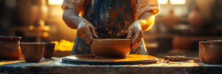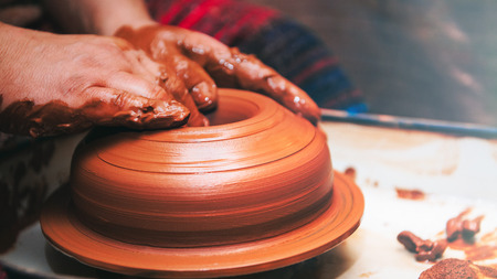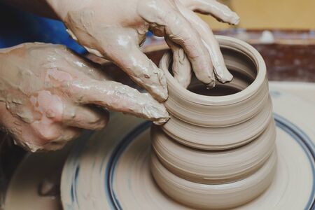 Hands of a potter. Potter making ceramic pot on the pottery wheel