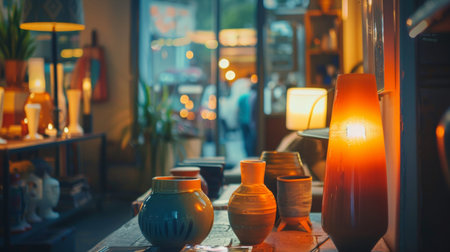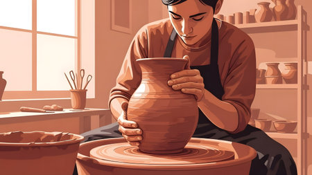 A woman shapes clay on a wheel in a cozy pottery workshop filled with handmade pots and warm light.
