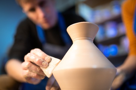 Close-up hands of a male potter. Artist is making a vase from clay, selective focus.