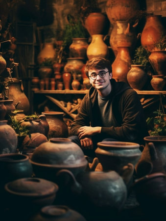 Professional male potter drying ceramic pot with special dryer in pottery workshop, studio. Crafting, artwork and handmade concept