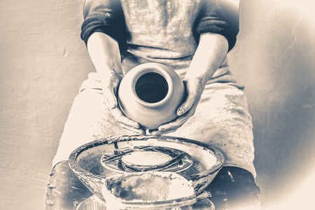 Potter holds more crude to the firing of white clay jug. Sculptor sculpts pots products from white clay. Master keeps on empty hands open earthen vessel. Workshop pottery. Old vintage style.