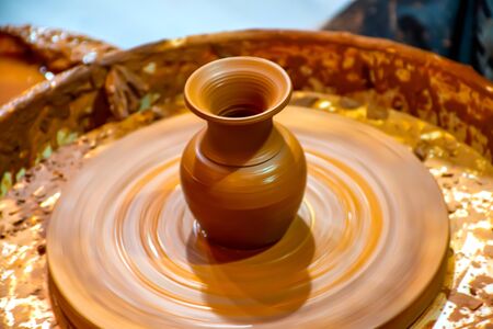 A new, rough, clay vessel on a potters wheel. Pottery. Close-up