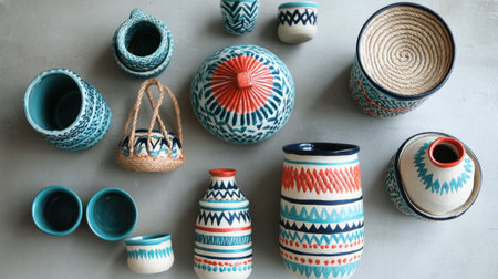 Vibrant collection of hand-painted ceramic pots with intricate patterns. That the image is generated using AI.