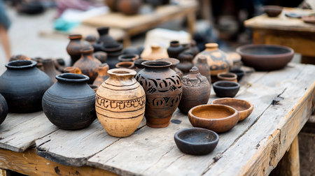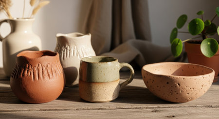 Handcrafted pottery displayed in a rustic setting, showcasing the imperfect charm and textured landscapes of artisanal work