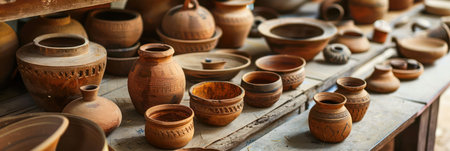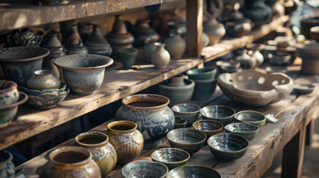 A collection of handmade ceramic pottery bowls and pots sit on rustic wooden table in workshop. warm sunlight creates peaceful and artistic atmosphere of traditional craft