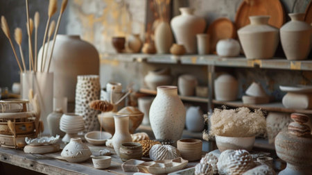 A variety of handmade pottery and ceramic vases displayed in an artisan workshop, showcasing craftsmanship and artistic talent perfect for themes related to art, creativity, and handmade goods.