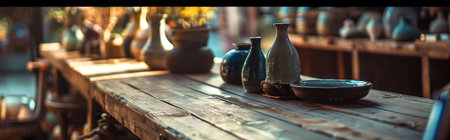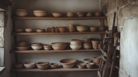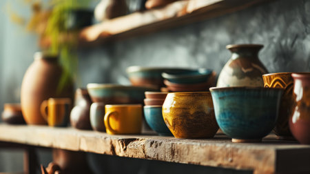 A rustic pottery workshop filled with handcrafted ceramics, capturing the essence of traditional artisanship.