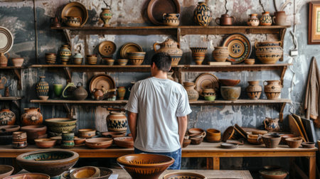 A man browses pottery in an artisan workshop, surrounded by handcrafted ceramic pieces on shelves, highlighting traditional craftsmanship.
