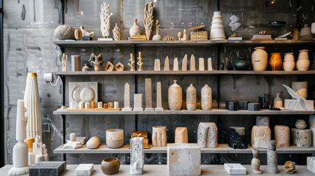 Shelves displaying a collection of handmade ceramic sculptures and vases in a variety of shapes and textures. The arrangement showcases artistic craftsmanship and creative designs.