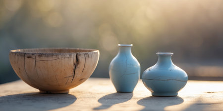 AI Generated. Wooden Bowl and Blue Ceramic Vases in Sunlight