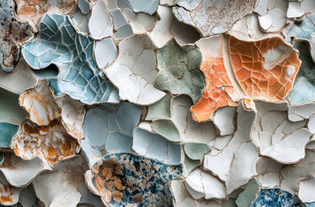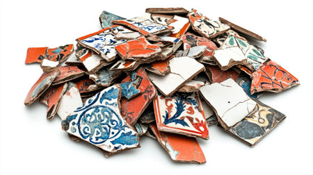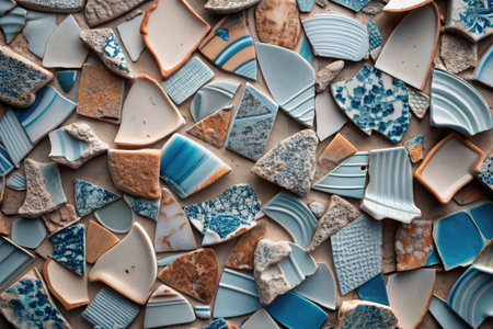 A unique collection of broken ceramic tiles showcasing various patterns and colors, perfect for artistic backgrounds or design projects. Ideal for crafting and creative endeavors.