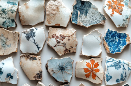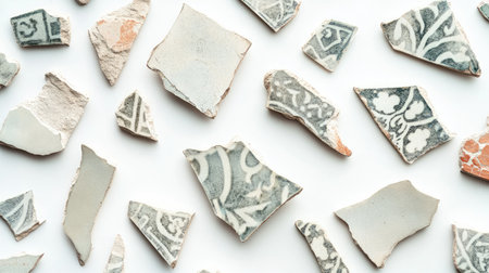 A visually appealing collection of ceramic fragments featuring intricate patterns, showcasing the artistry of vintage and historical tile design on a light background.