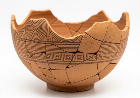 A fragmented ancient terracotta bowl with intricate geometric designs, showcasing its age and historical significance. The pottery is broken but still displays its original artistry.