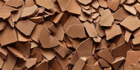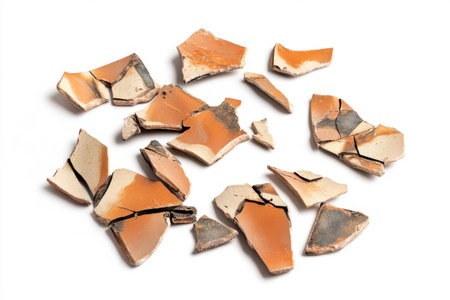 Stunning broken pottery shards arranged in a horizontal layout, ideal for textured overlays and artistic projects. Perfect for high-quality advertising.