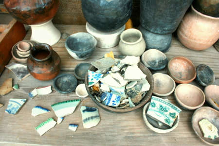 Clay shards or fragments old retro vintage antique medieval archaeological finds. Background with copy space for text or inscription
