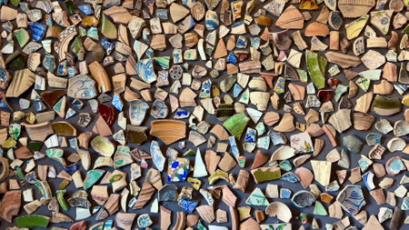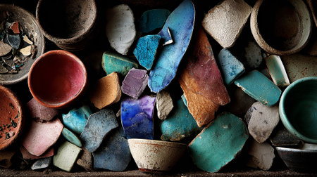 A vibrant display of broken pottery shards, showcasing colors and textures in an artistic arrangement.