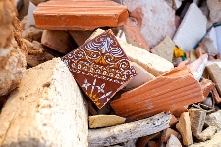 Broken tile fragments aligned in a line, capturing rugged textures and jagged edges in construction detail