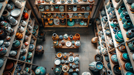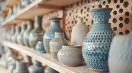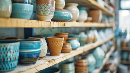 A variety of handcrafted pottery displayed on shelves in a ceramic workshop, showcasing artistic craftsmanship.
