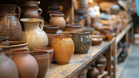 A collection of handmade ceramic vases and pots displayed on wooden shelves in a rustic decor shop. The earthy tones and artisanal craftsmanship create a warm and inviting shopping experience.