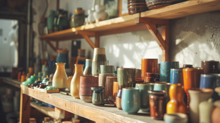 A rustic pottery workshop filled with handmade ceramic pieces displayed on wooden shelves, illuminated by warm light, creating an artisanal ambiance.