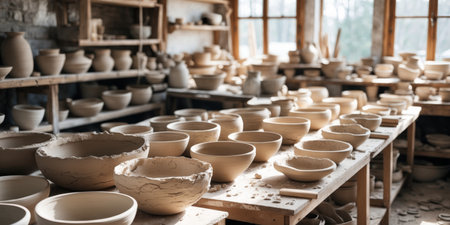 AI Generated. Unfired Clay Pottery Bowls Workshop Studio