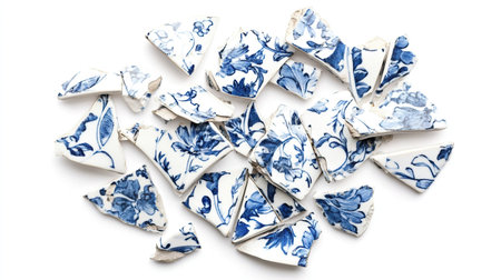 photo of broken porcelain shards with intricate blue and white patterns, detailed and sharp, shot from above, isolated on white background, photography --chaos 10 --ar 16:9 --style raw --v 6.1 Job ID: cadd83cc-0afe-4382-b05f-077ce3b24b92